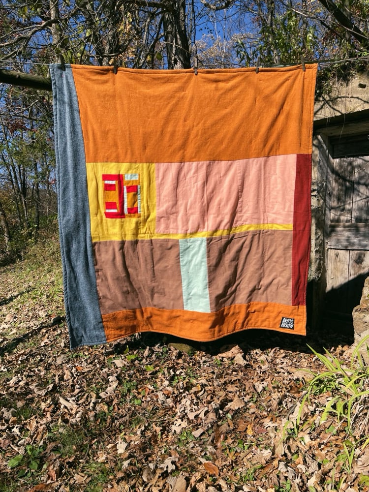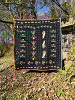 Each panel of this exquisite quilt was individually hand dyed- as in each image was painted on using a discharge dye technique, and then all the pieces sewn together, lined with an organic cotton lining and back with high quality cotton flannels, a red, brown , marigold and sea green solid and a blue and orange chevron/herringbone pattern. The layers hand sewn together with red thread, leaving little sparks all over the quilt to ignite the fires of imagination. This is a total Storytelling & Spellcaster work of fine art I am very proud to present.